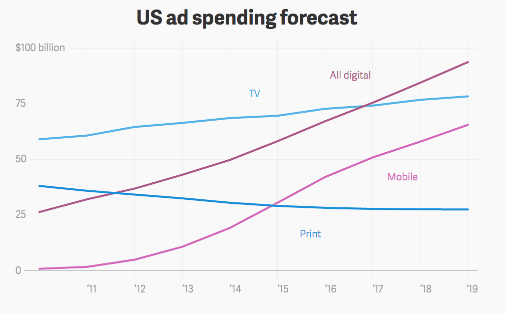 If the forecasts based on current data from emarketer are correct, the US is about to spend more on digital ads that it does on to TV for the first time ever. This is the culmination of years of growth in digital advertising, but has been given a massive boost by the explosion of mobile ads over the last couple of years. From virtually nothing a few years ago, mobile advertising is in a renaissance. Now that over 50% of internet users are on mobile devices, it makes sense for budgets to be shifted to digital spending.