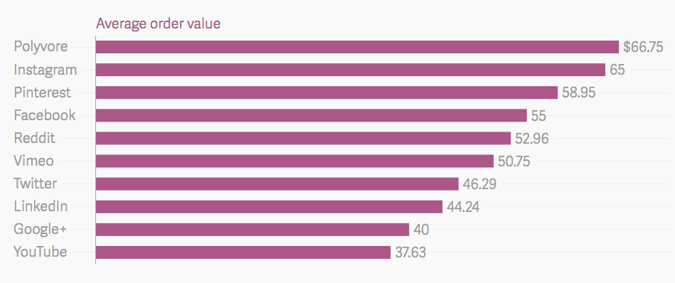 Data from QZ.com shows how average order value fluctuates widely between users of different social networks. Polyvore tops the list, which is hardly surprising given it's a site built around fashion and social commerce. If you aren't a fashion retailer it's not really relevant. However, Instagram could be relevant for all sorts of B2C verticals and has an average order value almost double that of the likes of YouTube and Google+. It's interesting how the networks really focused around visuals (Instagram, Pinterest, Facebook to a lesser extent) come out top here, whilst those less built around sharing photo's (Twitter, LinkedIn, Google+) sit at the bottom. Perhaps a valuable lesson in the importance of visuals to conveying your brand message.