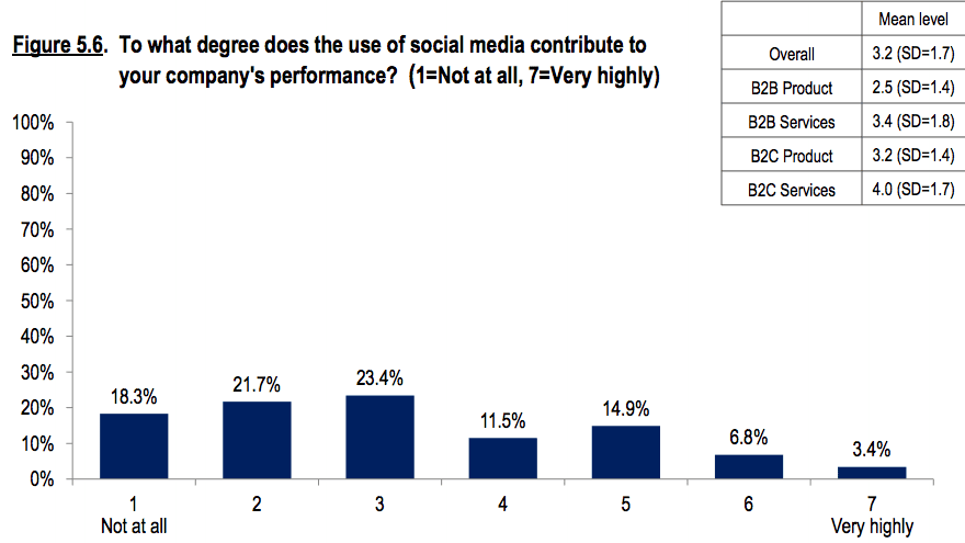 A 2016 survey of 289 US based CMOs by cmosurvey.org found some interesting if disappointing results regarding the value of social media. Although 4/5ths reported at least some contribution by social media to their companies performance, very few thought it was a big contributor.