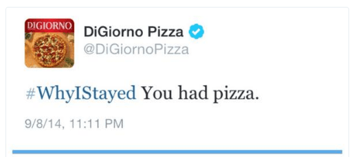 For example, in 2014, DiGiorno Pizza decided to capitalize on a trending hashtag at the time that read #WhyIStayed.