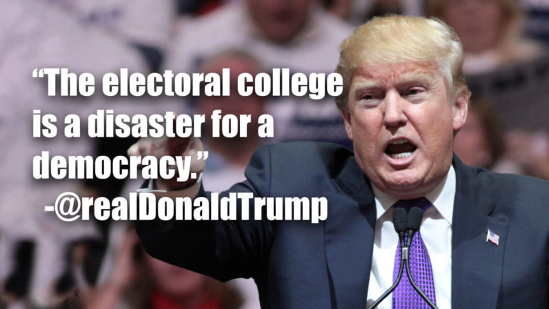 Donald Trump is going to be the next US president. But according to his own Twitter logic, he shouldn't be. The night of the 2012 election, in a fury over Obama's imminent victory, Trump tweeted his disdain for the Electoral College: The electoral college is a disaster for a democracy. - Donald J. Trump (@realDonaldTrump) November 7, 2012 Other choice words: “We are not a democracy!“ “He lost the popular vote by a lot and won the election. We should have a revolution in this country!” [Deleted] “The phoney electoral college made a laughing stock out of our nation. The loser…